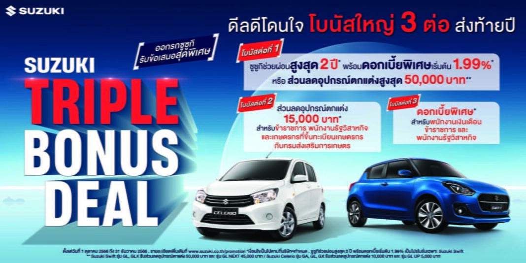 แคมเปญ “SUZUKI TRIPPLE BONUS DEAL” ดีลโดนใจ โบนัสใหญ่ 3 ต่อ ส่งท้ายปี มีรายละเอียดดังนี้