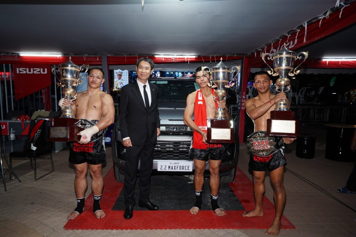 มร.ทาคาชิ ฮาตะ กรรมการผู้จัดการ บริษัท ตรีเพชรอีซูซุเซลส์ จำกัด กล่าวว่า “ขอแสดงความยินดีกับ จรวดศึก และ เขี้ยวเพชร ที่คว้าแชมป์ THAI FIGHT 2025 มาครองได้อย่างสง่างาม ด้วยหัวใจนักสู้ที่แข็งแกร่งจนได้รับพระราชทานถ้วยรางวัลอันทรงเกียรติ ซึ่งถือเป็นความสำเร็จอันน่าภาคภูมิใจในอาชีพนักชก ผมขออวยพรให้ทั้งสองท่านประสบความสำเร็จยิ่งขึ้นไปในอนาคต พร้อมกันนี้ ขอขอบคุณผู้ชมทุกท่านที่ให้การสนับสนุนรถอีซูซุ รายการ Isuzu Thailand Championship และ THAI FIGHT ด้วยดีเสมอมา ทุกแรงใจของท่านคือพลังสำคัญที่ขับเคลื่อนให้อีซูซุมุ่งมั่นพัฒนาอย่างไม่หยุดยั้ง และเราหวังเป็นอย่างยิ่งว่า จะได้รับความไว้วางใจจากทุกท่านเช่นนี้ตลอดไป”
