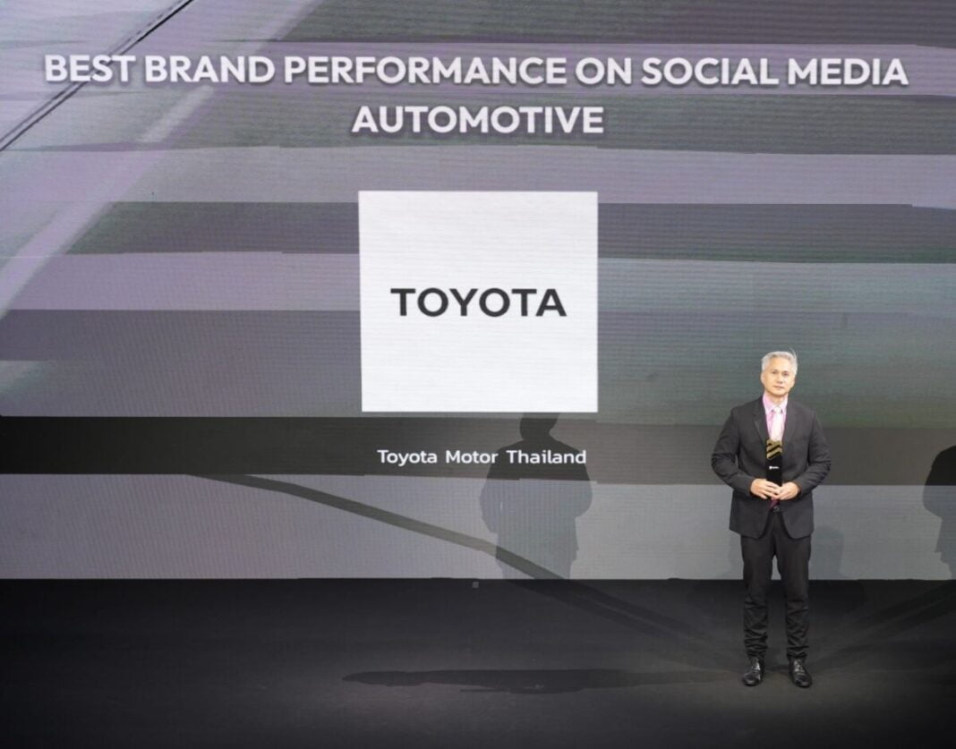 บริษัท โตโยต้า มอเตอร์ ประเทศไทย จำกัด คว้ารางวัล “BEST BRAND PERFORMANCE ON SOCIAL MEDIA” หรือ “แบรนด์ที่ทำผลงานยอดเยี่ยมบนโลกโซเชียลมีเดีย” สาขากลุ่มธุรกิจรถยนต์ 4 ปีซ้อน (2021-2024) จากการประกาศรางวัล THAILAND SOCIAL AWARDS ครั้งที่ 12 โดยมี นายอภิสิทธิ์ กาบบัวลอย ผู้จัดการโครงการ ฝ่ายบริหารการตลาดและประชาสัมพันธ์ เป็นตัวแทนรับมอบรางวัล เมื่อวันที่ 1 มีนาคม ที่ผ่านมา ณ ทรู ไอคอน ฮอลล์ ไอคอนสยาม ชั้น 7