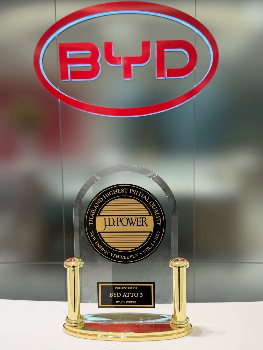 กรุงเทพฯ – 10 กุมภาพันธ์ 2569 – บริษัท บีวายดี ออโต้ (ประเทศไทย) จำกัด ได้รับเกียรติจากบริษัท เจ.ดี. พาวเวอร์ (J.D. Power) ในการมอบรางวัล Initial Quality Study (IQS) สำหรับรถยนต์พลังงานใหม่ (New Energy Vehicle Segment) หลัง BYD ATTO 3 ครองอันดับสูงสุด ในกลุ่มรถยนต์พลังงานใหม่แบบ SUV (NEV SUV) ด้วยคะแนน 149 PP100 ตามผลการศึกษาคุณภาพรถยนต์ใหม่ในประเทศไทย ประจำปี 2568 หรือ J.D. Power 2025 Thailand Initial Quality StudySM (IQS) สะท้อนถึงมาตรฐานการผลิตและคุณภาพระดับชั้นนำ โดยพิธีมอบรางวัลมี นายหยู่ปิน เคอ ผู้จัดการทั่วไป บริษัท บีวายดี ออโต้ (ประเทศไทย) จำกัด เป็นตัวแทนบริษัทฯ รับมอบรางวัลจาก นายอัตสึชิ คาวาฮาชิ ผู้อำนวยการอาวุโส เจ.ดี. พาวเวอร์ ประเทศญี่ปุ่น